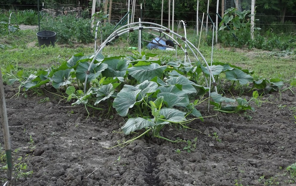 The other 1047.5 to be grown in the normal manner. It is doing well, despite having the main rolled by wind the day plastic came off the hoops. It ended up having a couple secondaries going the wrong way. It left 2 gaps. So we will train a couple tertiaries to fill them out.