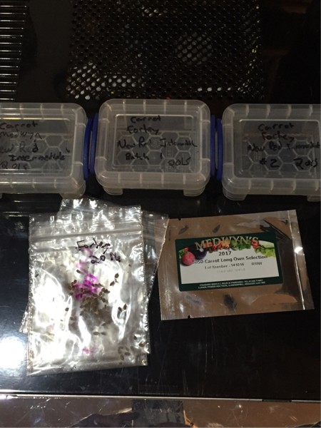 I pulled out my stash of carrot seeds. Thinking about it, i sent an email off to Aphis, USDA to inquire when I will receive my seeds from last year. For all I know they are still playing ping pong between Opa Locka and Miami. Tentative launch of GiantCarrot.com is winter of 2019/2020. I will need seeds for this. As biennial plant will have to start them this year. I have both Fortey and Medwyn seeds from multiple years, including sister seeds of the current world record. I am not going to keep them separate..all the same variety. Planning on starting 150 plants...top 50 will be vernalized. Trying to pick start date...If I start now..could have 5 pound carrots to store by fall, not enough cooler space for that. Maybe it will be a 4th of July start.