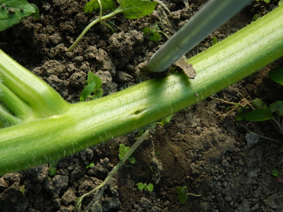 I found this on the main about 3' past the fused stem/secondary. There is no frass around the hole so I think it is just a split and not a borer. I hope. I found one short, borer damaged secondary on the 899 yesterday. I sprayed insecticide today.
