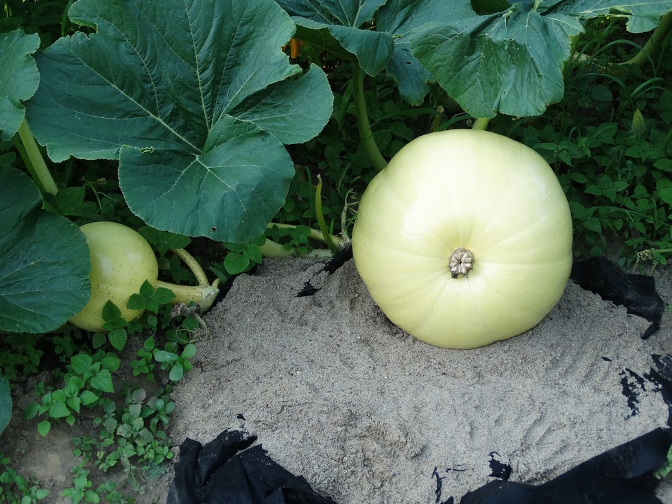 The first pumpkin to earn a bed of sand and a white sheet. 1200 Engel pollinated by the bees on June 23 when we were on our way back from our fishing trip. The smaller one to the left was pollinated a couple days later, right where the main self terminated. I will let them go a couple days more before committing to one of them. If I keep the open pollinated fruit, the vine will be terminated right there.