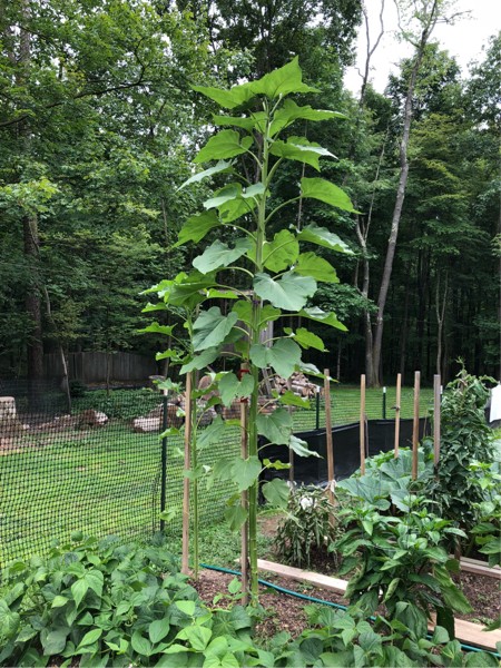 Store bought gray stripe sunflower reaching for the sky. I need to get a better support for it before it comes crashing down.