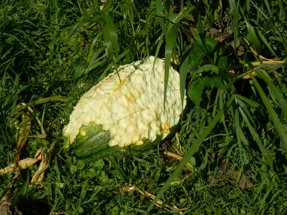 A field pumpkin that the critters wrecked, I cut from the vine and put in the cull pile. They hit it big time last night. At least it is drawing them away from the garden. Groundhog season is open all year in Iowa. The critter is in danger of lead poisoning,