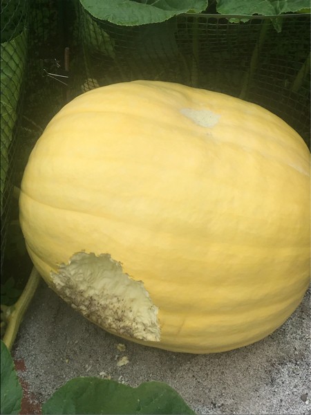 Ok enough is enough. Had a small fence around the pumpkin a sheet over and a piece of styrofoam on it. Looked good yesterday. Peaked at it today. Our 2nd biggest pumpkin. Down goes the 1810 werner. Sad