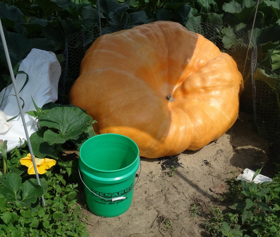 The 1200 Engel, now estimated 840#. Plant seems healthy, but growth has slowed to 10# per day. I hope it was just a week of cool evenings. We got plenty of rain and were should have warmer temps the next week. It has nearly 1000 square feet of plant behind it. I sprayed for cucumber beetles last evening, only found 1 today and squished it. I added Daconil to the spray to prevent mildew. Valley fog was setting in, ideal conditions for mildew. This evening they get sprayed with milk.