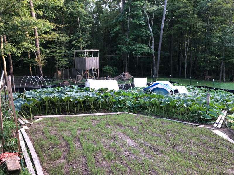 My 2118 Jutras squash plant. Lots of it is third stage growth that I let fill in where I lost a bunch of leaves from sunburn. I hope it�s enough to keep Gangrene growing for another month or more You can also see my winter rye coming up.