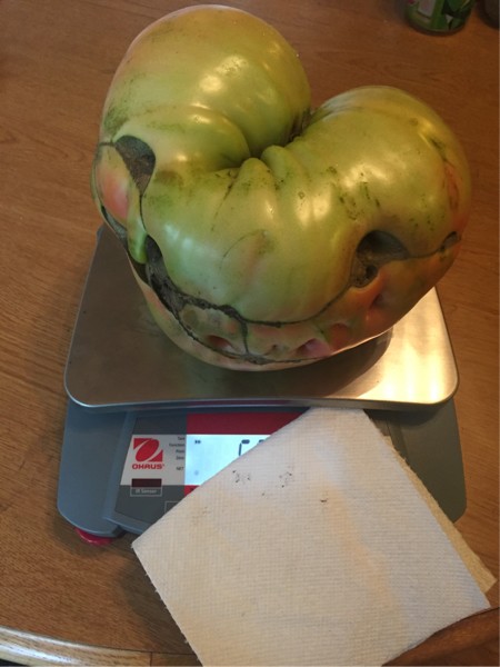 Picked my biggest tomato that I have left. With already about an inch of rain and more forecast for the next 4 days I did not want to take a chance with damaged. Unless one of my younger sets picks up the pace this one will be my Gale Woods entry...if she survives 2 weeks 5 days in the refrigerator.