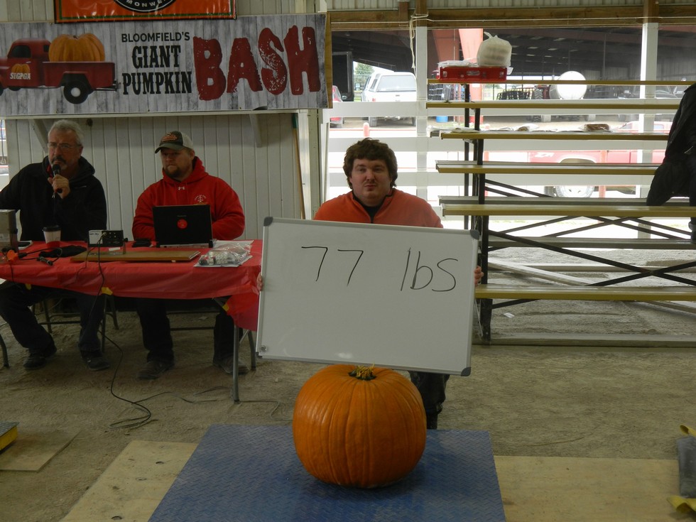 My son Jacob McWilliams took 3rd place for the second year in a row with this 77# field pumpkin. He also won 5# of Wallace Pumpkin Pro and a pizza in the door prize drawings.