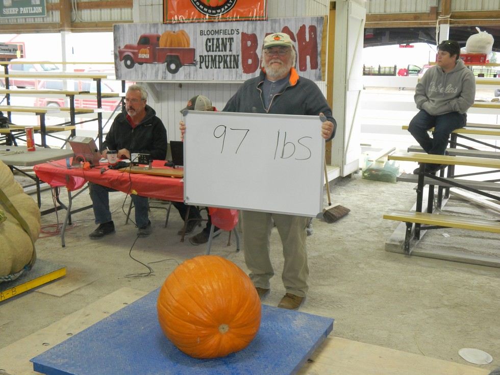 I took 2nd place in the field pumpkin division with this 97#. I grew it from a seed out of the 87# that won me second place last year. I also won a pizza and a bag of Wallace Starter Packs. We had most of my pizza eaten by the time we got home. We had another great time at Bloomfield.