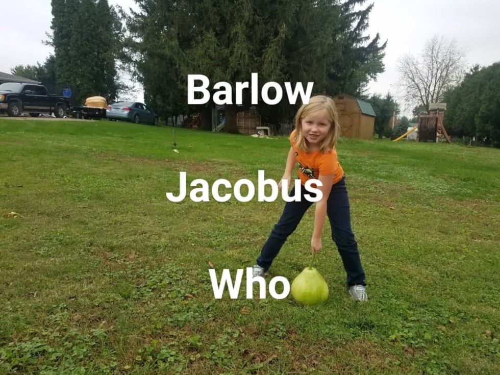 This is just funny, unfortunately the bushel gourd split on the 100 ft travel to garage in back of truck. Weird. She weighed in at 8 lbs