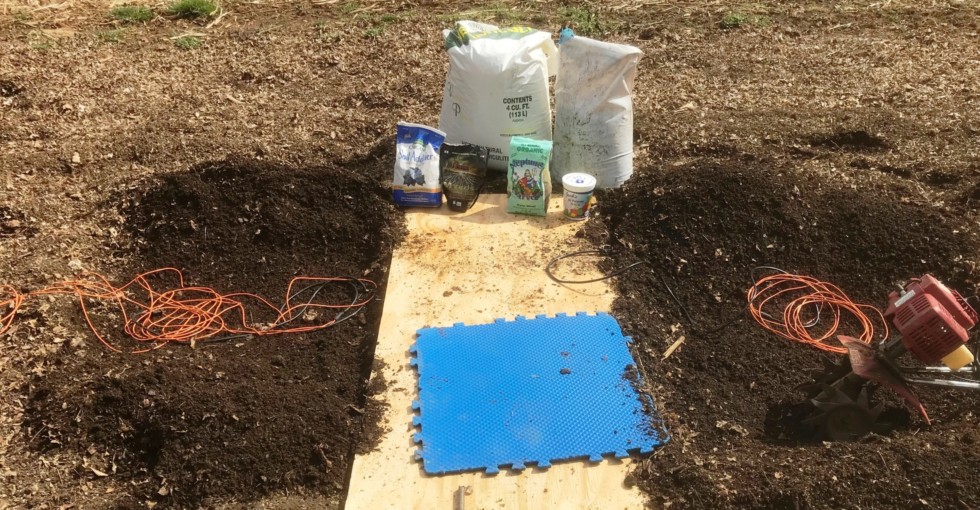 Prepping the planting pit. 20 lbs of sterile dehydrated mushroom soil, handful of sulfates to control resulting alkaline pH, kelp meal, full handfuls of mycorrhizae, double pinch of Jack�s 20-20-20 soluble fertilizer and a pail of vermiculite. Heating cables ready to go.