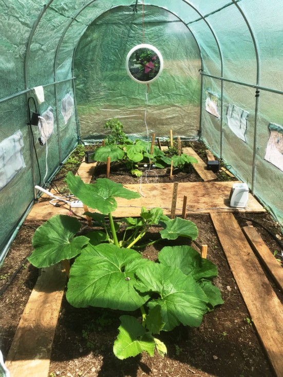 Back from vacation, and it looks like El Cheapo green house and cruise control irrigation and heaters did their respective jobs, despite days of cold rain all week. No catastrophes. Main stem on the 1613 does have a kink, however, and a few longitudinal slits. Rest of plant looks great. The 1501 is OK as well. The back up 1795 is small but growing. Stored a tomato plant and 2 eggplants there are too, but gotta get them out; the 1501 is overrunning them. Plan to start erecting fencing very soon. The 1613 will be out of the green house in a few days. Plan to move the entire unit to cover only the 1501, leaving the 1613 out in the brutal world.