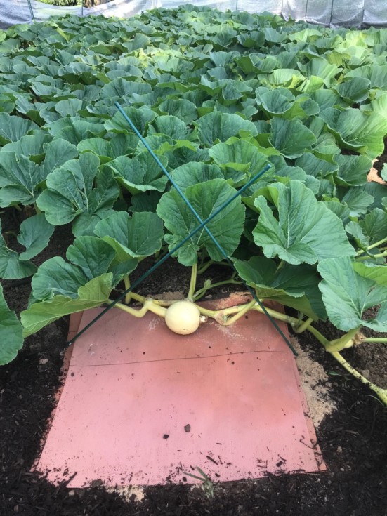 9 DAP on the 1613. Plant remains very healthy and relatively huge. 3 growing fruits on the 1501, DAPs 2-6. Polinated 2 more today. Cut ends off most secondaries, as they reach the fence and today cut tip off both main vines. 2nd Application of Heritage, Merit75WP and foliar spray of Jacks 20-20-20. Will switch to Jack 10-30-10 from now on. All buried nodes get the usual concoction. Plan CalVantage tomorrow, and maybe some phosphite.