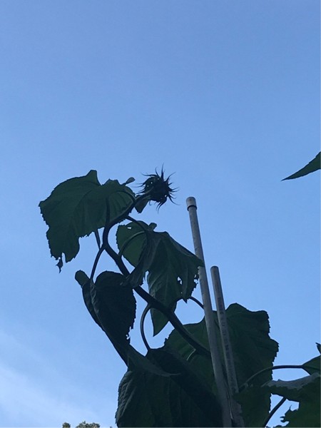 So I added some extra support at the top, now I need to bend the top of the sunflower back and tie it to the pole. I have absolutely no idea how I�m going to do that. She�s 15 feet tall and I don�t have a ladder that tall. Hmm, this is frustrating