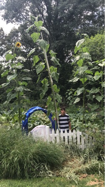 Giant sunflower does not want to stop growing! She�s close to 18 feet I think. I�m 6 ft