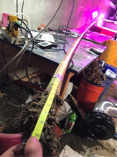 Giant sunflower is taller than I thought! Under those roots is the stalk. Didn�t know it kept going. So that adds on another 5 or so inches. She�s measuring at 18 feet and half an inch! Woo. The fair never measures them right so maybe I will just keep the tape on. LOL.