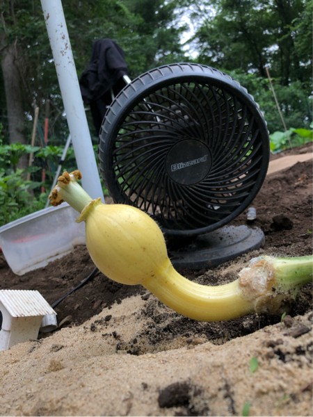 Time to update on the 1989 Daletas. She is 4 days old today. This is the one that I need to work out because my main broke and this was the last pumpkin before break. Others weren�t growing. I�ve terminated a lot of vines in the last few days. 8 secondary�s remain. 3 are 2-3 ft long. Last night the stem oozed a ton. I guess that�s a good sign but don�t want it to get out of hand! Big plant behind her. Have to set her up soon. Cmon baby!