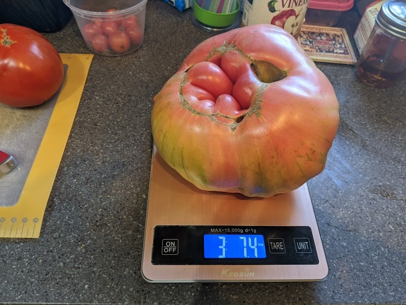 Bottom side. Plan on breaking out of the rut tomorrow. My big 9.65 is probably only 40% blushed today, but had one a day or two further along go bad today so no use playing with fire for a couple more ounces on a tomato that should easily be my PB if it weighs anywhere close to it's measure.