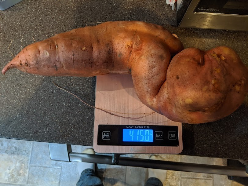 This was the biggest of the year, an ounce shy of 5 lbs. Can't remember what variety I started with but a few years ago grew some larger than normal ones. Have started my own slips from one of the big potatoes each year and have been happy with the size each year. Have had them as big a 7 lbs.