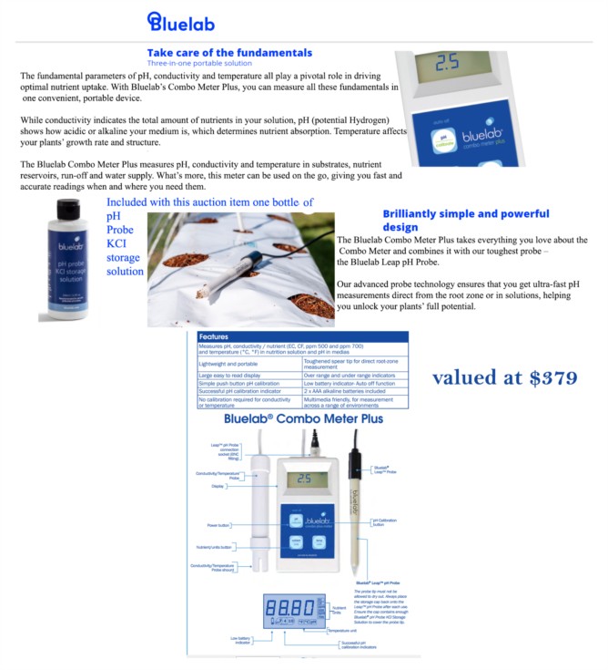 The Illinois auction will be held on 2/25/22 This item ships to you for free and is only available to residents of the continental states Bluelab Combo Meter Plus Retail value $379. Information and instructions here https://bluelab.com/usa/bluelab-combo-meter-plus Measures pH, conductivity and temperature on the go Our best-selling meter paired with the Leap pH Probe for quicker measurements in any substrate Includes calibration-free Conductivity Probe Automatic temperature compensation for accurate readings everywhere Customize scales to your preference - conductivity in EC, CF, PPM 500 (TDS) or PPM 700; temperature in �C or �F