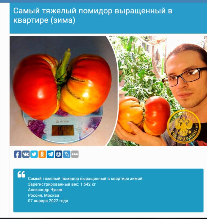 my tomato is officially registered as the largest tomato in Russia grown in winter!