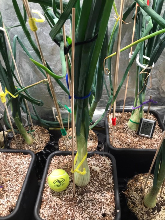 A shot of the giant onions. 4 in 15 liter Autopots and 4 in 6 liter Air Pots. Hoping to get the greenhouse set up and get them outdoors. Been running 16 hour of daylength for a couple weeks or so.