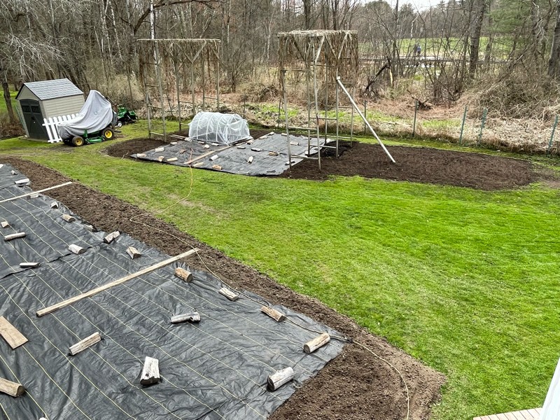 Old patch pumpkin area has some weed block too. The pumpkin space there is just 400 square feet. Next weekend we will focus on putting the tomato greenhouse up. All hoops are warming up and drying out nicely due to the sun and soil heat cables. The past week we have seen a lot of flies in all of the hoops which is good. It is important to warm the soil up enough for the corn seed maggots to hatch and not eat our plant roots.