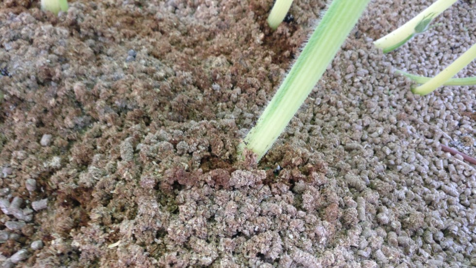 It's then covered with a few inches of straw mulch. It's important to keep the light out and the moisture in. It also helps prevent weeds. If the mulch wasn't present, the soil on the newly buried vine would quickly dry out and the emerging roots wouldn't be happy.
