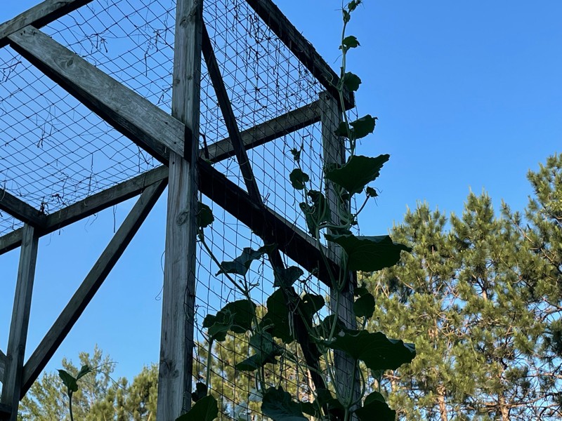 Weird prospective here with the 152 Yohe long gourd, but it is hard to take a photo of a plant over 15 feet in the air. If it does not bend towards the trellis top I will help it with twine. This plant is starting to throw lots of males and females.