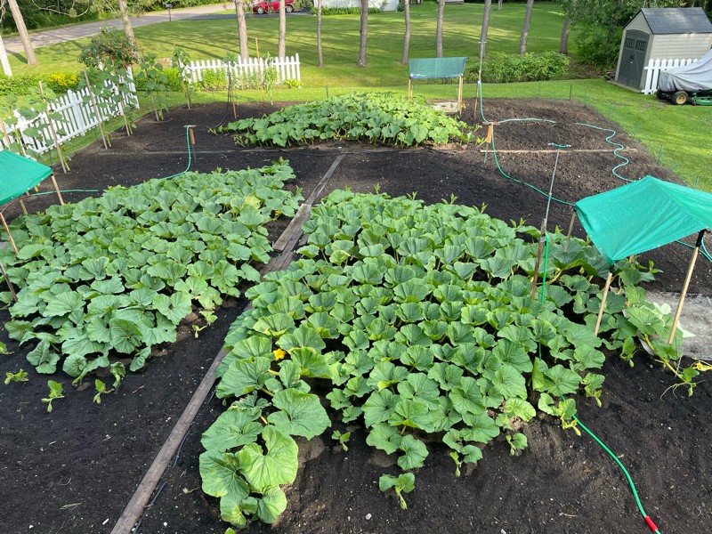 Happy 4th of July! Here is the overview of the new patch. All 3 plants are growing well and we have removed the last pieces of weed block. We are now burying vines every 3-4 days as they are growing 8-10 inches a day now.