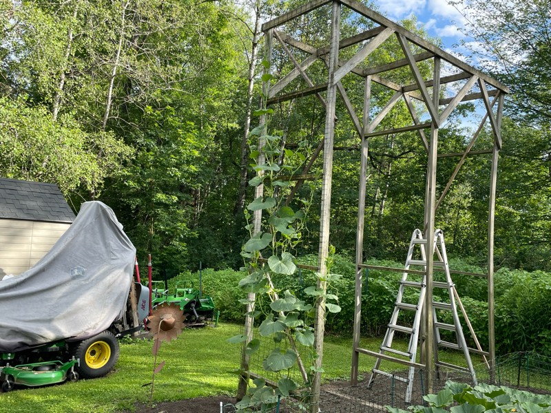 The 157 C Ansems Lin gourd is about a foot from the top of our 14.5 foot trellis. We are starting to see male and female blossom, which is a good sign.