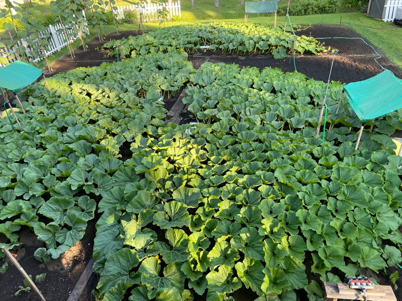 The 2400 square feet is filling in nicely with the 3 plants and soon vine burying season will be done. The 1469 Young has a small leaf issue that looks like a manganese deficiency, so I foliar sprayed manganese on Friday evening.