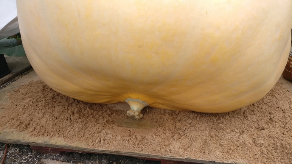 And the problem is that if I leave as is, then it's quite possible the pumpkin will grow over the blossom, which will then press against the board. At the moment it's about an inch away. If it pushes against the board it'll have nowhere to go apart back into the pumpkin, which may well cause a split. Moving the pumpkin at a tilt so the blossom points outwards or to the sky isn't really an option; instead I'll somehow have to remove a section of board so the blossom will be free to move downwards where there is space.