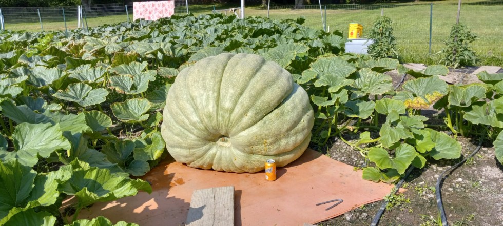 842 Barker squash at day 40. Nothing impressive here. Around 617#, averaging 24# a day the past 10 days. I did a tissue test on this plant because I suspected a deficiency. It was deficient, but not what I expected. Very deficient in iron, and that boggles my mind. Also a little low on sulfur and copper. Did a 30 gallon drench 2 weeks ago to try to help it.