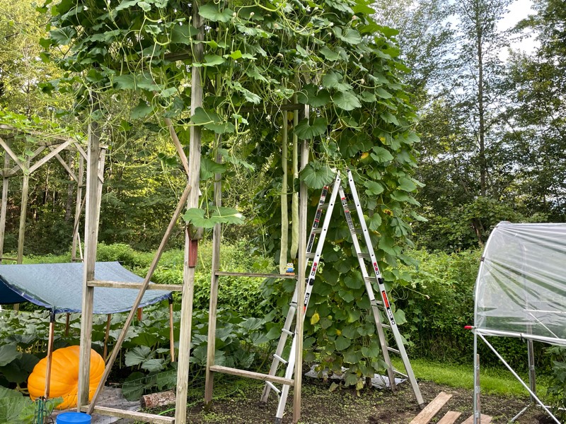 We have 3 long gourds growing on the 152 Yohe trellis. I have just pollinated the first on the 157 C. Ansems tonight. We should know by next weekend if they took.