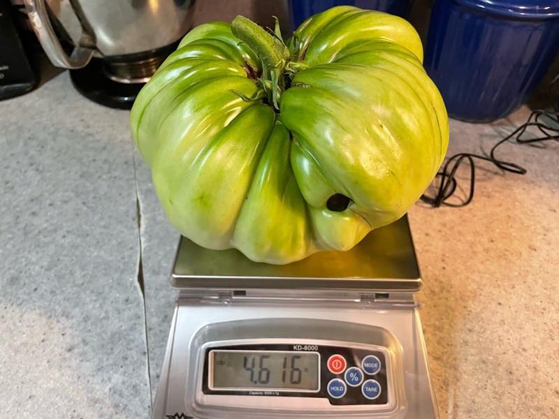 Picked an early tomato for our fair off the 6.55 Rose and it weighs 4.61 pounds. This is the plant with 2 tomatoes and is the lower and smallest one by measurement.