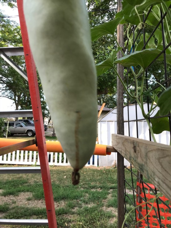 Long gourd sprang a leak, I'm sure this is what caused the stop in growth. Another leak broke out just above this one. They appear to have stopped oozing and I keep it dusted with sulfur and things are looking OK. Time will tell.