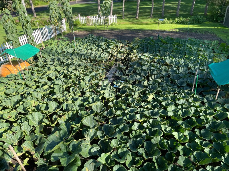 Last picture in August as summer winds down. Happy to say we still have 3 pumpkins alive and slowly chugging along. Disease is starting to take hold but we have enough green to last for a few weeks.
