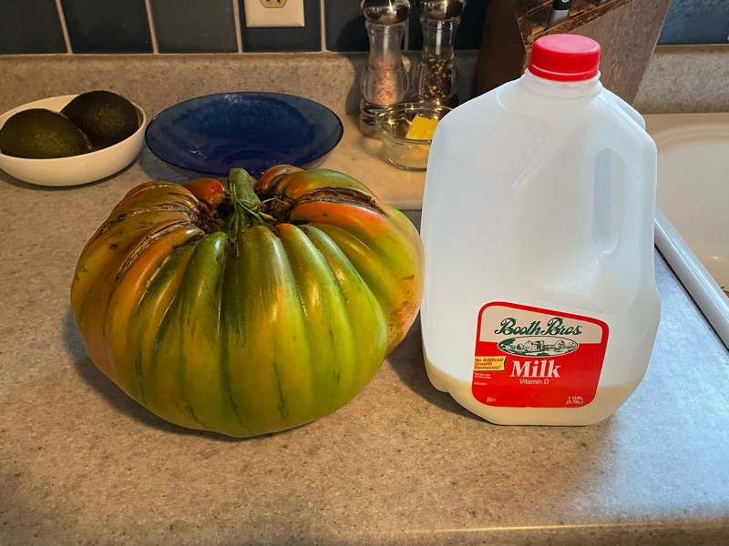 Lil Miss single bloom from the 8.35 Strickler has told us that it is time to be weighed. Here she is with our model gallon milk jug. We will be meeting the VT Secretary of Agriculture tonight at a local grocery store as this measures larger then our new State record of 7.28. Fingers and toes are crossed!