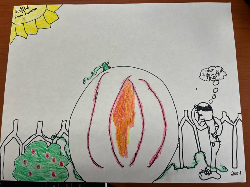 I found this picture that my then 8 year old daughter Lauren drew for me. It reminds me of Tim as he has to figure out how the hell he is gonna get that pumpkin out of his backyard garden.