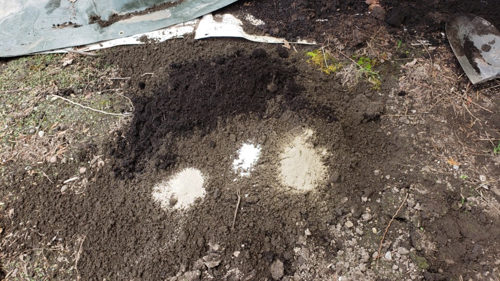 The vine burying mixture. The very dark material is compost from the landfill. The light soil is mostly sand and is a lawn mixture. The small left addition is mycorrhizae. the The middle is Azos. The right pile is Gaia Green 4-4-4.