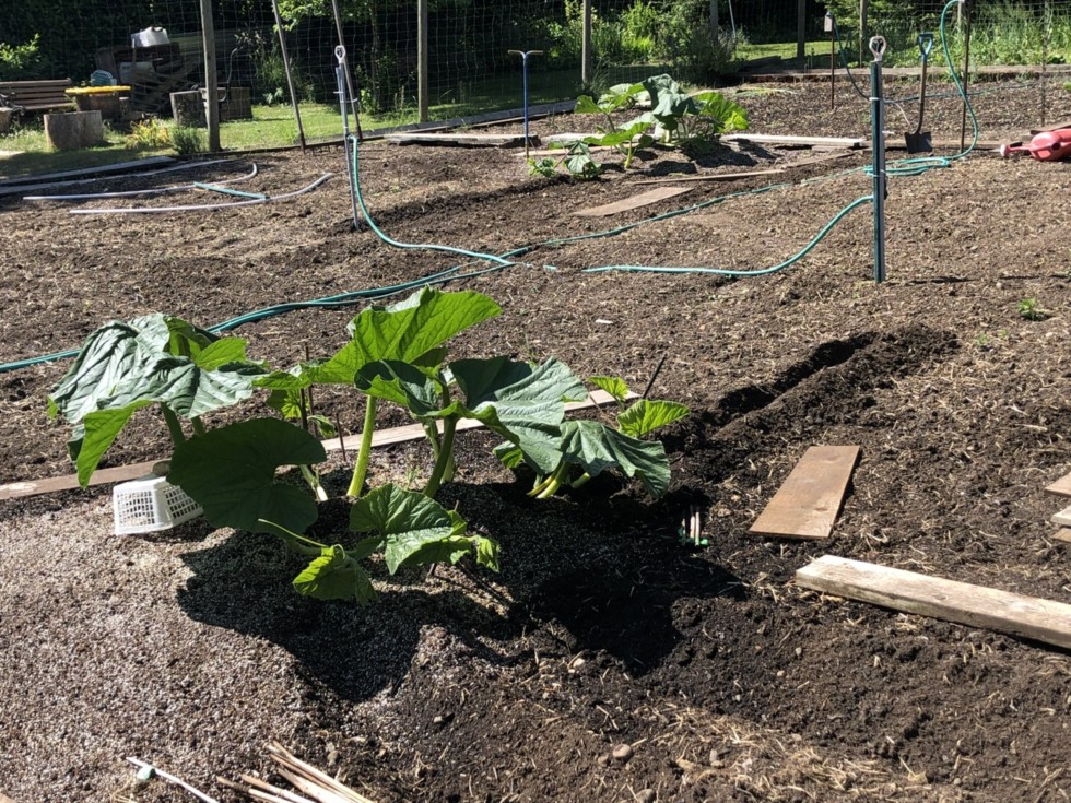 Plants are taking off now, it will be a sea of green not long from now. Well, as you can see, I do rake trenches for vine burying ahead of the plant, as I actually find it easier and a time saver to just to allow the vines to go where I want them (in the trenches) and then easy to cover, done and done. I do a few trenches each day while the secondaries are popping out and claiming ground space. Also, we didn�t stockpile compost or any vine burying mix this year anyways after adding copious quantities last year.