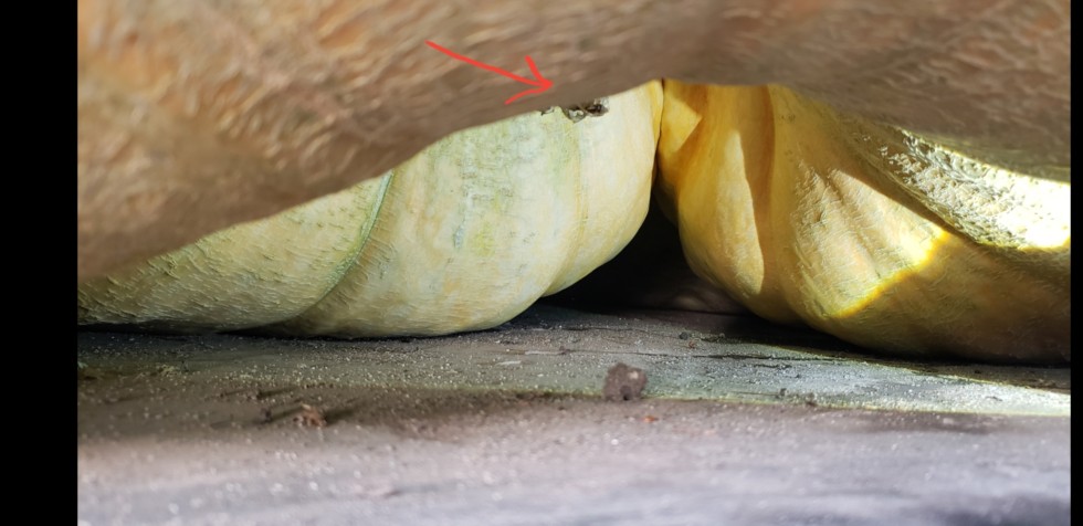 The 2356 Mendi is growing over the blossom end so much so that I can't get my cell phone under to get a picture. Since I'm growing on a hard board, I can't dig a hole to protect it. Looks like the pumpkin may protect itself by growing a hollow space around the blossom. Since I never water overhead or foliar feed , it never gets wet under there. I'll keep a fan blowing in that direction.