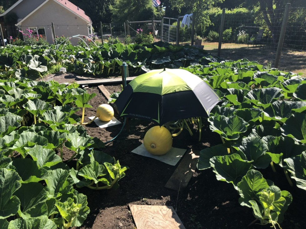The prizewinners are getting golf umbrellas now. I had to do shout out to my golf buddies and ask for any damaged, worn out or unwanted umbrellas to replenish my stock. After awhile they get sun beaten and repaired with duct tape only so many times. We have 3 pumpkins on 1 plant and only 2 on the other, they will be beauties.