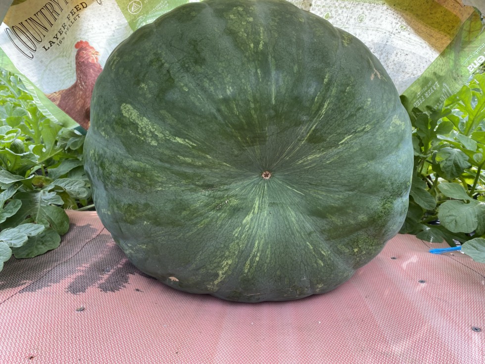 Not happy with this melon. It is one of the two on my 211. Not sure if I will plant my 211 again. As it is showing some light spots. The 211 was open pollinated and it was not isolated from eating melons. I think it might have picked up some pollen from a legacy or maybe even something else. The other melon on the plant is a more uniform dark melon. More like it�s mama. This melon is probably as tall as it is long!