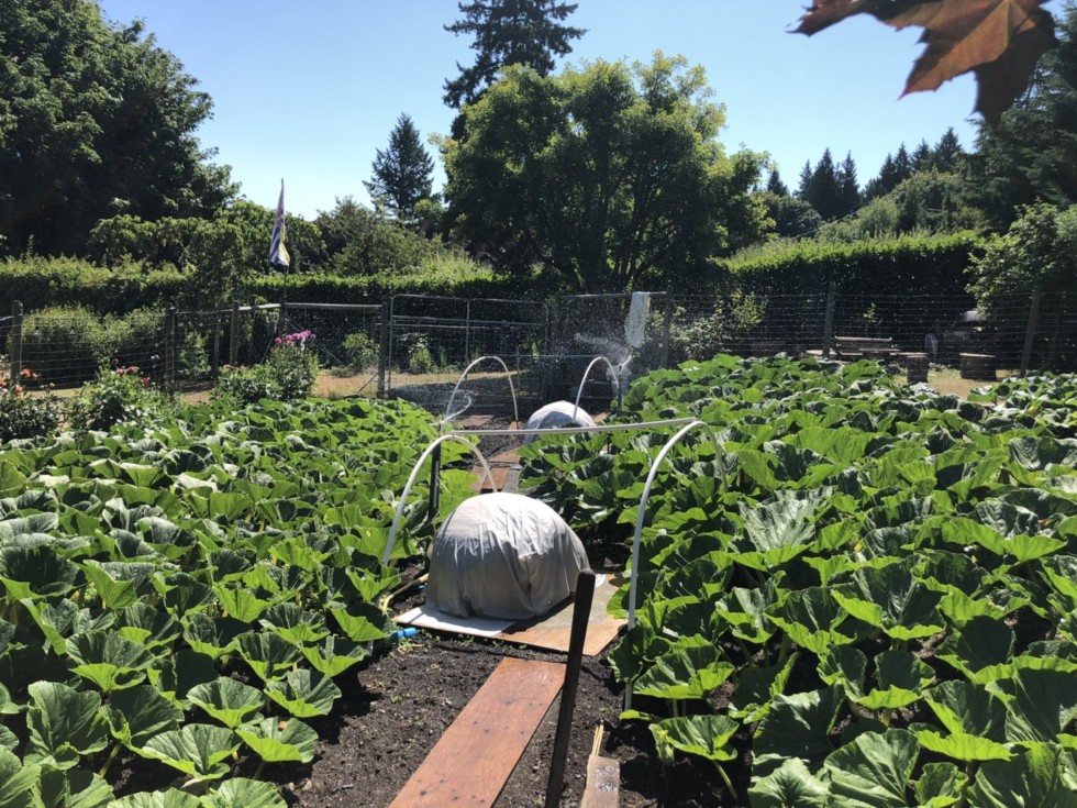 AG plants getting a morning watering. Real reason we don�t cover the hoops right away is lazy and, I never get it right the first time and put one side too close. One pumpkin has grown forward and is partially out of its hut. I don�t want to move the pumpkin, so moving it�s tent seems reasonable.