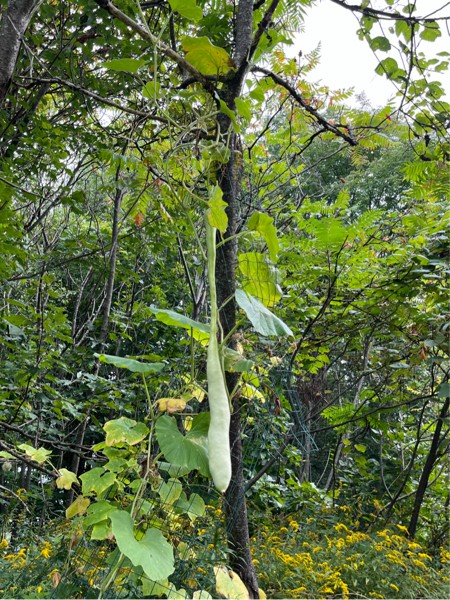 The long gourd is something to talk about. It has 30 leaves and loves the natural trellis.