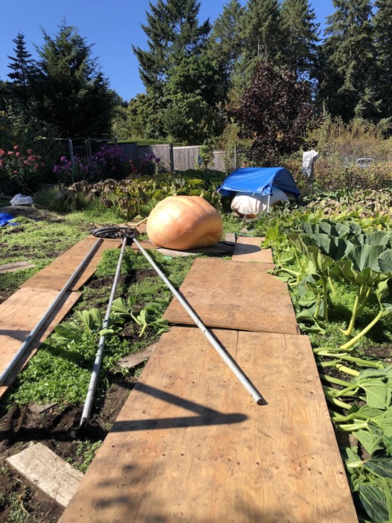 Plywood road, tripod and pumpkin lifter are poised and ready to go. All I need is the ladder and we will hook up the chain hoist and raise the legs and centred over the pumpkin. We always use extra precautions to secure the bottoms of the legs so they don�t dig into the soil as the pumpkin is lifted. Gets easier every year.