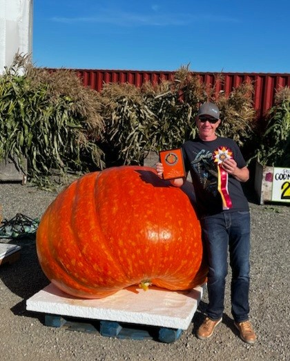 This is Trevor Halliday with 1 of his Howard Dill winners. He's the rising pumpkin growing star in Maple Ridge British Columbia. His 1st year was a 700 pounder. His 2nd year was 2 x 1400 pounders. This is his 3rd year. 1742, 1692.5 and 1028 lbs for a jacket winning grand total of 4462.5 pounds !! PLUS 2 of them were Howard Dill winners !! AND he grew these outside with no greenhouse !! Pretty awesome....eh ??