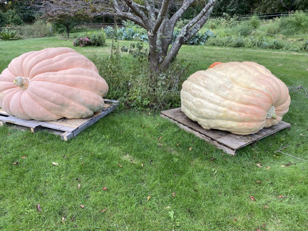 Back home. The 1604 is on the left and the 1570 is on the right. Don�t be deceived by the photo the 1570 was actually a larger pumpkin in dimension. The 1604 never really impressed me but it grew slow and steady. The 1570 on the other hand was something else and I know it would have been much bigger if I had been able to keep the stump plus it was harvested Labor Day weekend out of extra caution.