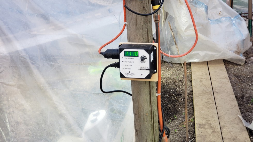 This is the "black box" that regulates the compressed CO2 levels. You set the high and low levels and it will turn the regulator valve on or off. I found that a tank of CO2 did not last very long(3 days) and it was quite a chore and expense to go get another tank. So the reason that I couldn't use the space heater continuously was because it gave off too much heat. Even though the system was very clumsy I think it did the job of making the plant grow very fast. A female was pollinated at 15 ft on May 28th!! Will use CO2 again next year but will devise a better system.
